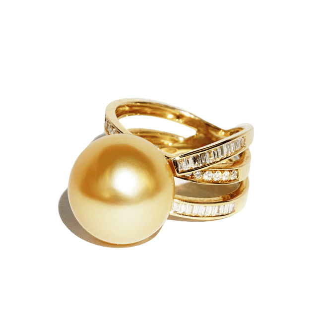 This elegant 18K yellow gold ring boasts a 14mm golden south sea pearl and shimmering diamonds.